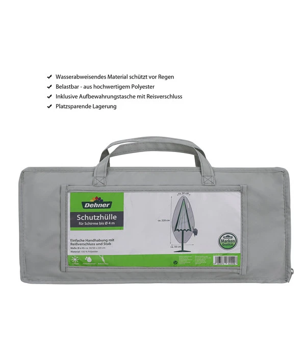 Mit der Abdeckhaube für Schirme in Dehner Markenqualität schützen Sie Ihren Sonnenschirm vor Regen und Schmutz. Die Schutzhülle verhindert, dass Regen oder Feuchtigkeit in die Falten des geschlossenen Schirms dringen können. Dadurch werden Stockflecken durch stehende Nässe vermieden. Gleichzeitig schützt die Schirmabdeckung die Öffnungsmechanik des Schirms vor Rost und trägt so zum reibungslosen Öffnen und Schließen Ihres Schirms bei. Mit diesem Rundumschutz haben Sie lange Freude an Ihrem Gartenschirm.