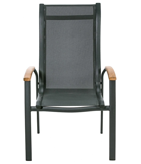 Für den besonderen Sitzkomfort ist vor allem das moderne Gewebe auf der Sitz- und Rückenfläche verantwortlich, das genau den richtigen Mittelweg zwischen angenehm stützen und flexibel nachgeben findet, denn es ist elastisch und formstabil zugleich. Textilene ist außerdem strapazierfähig witterungsbeständig, atmungsaktiv, UV-fest, wasserabweisend und schnell trocknend. Und pflegeleicht ist das Material außerdem. Auch das Aluminium-Gestell des Stuhls ist wetterfest, so dass der Dehner Stapelstuhl ‘Chicago Wood‘ bestens für ein langes Leben unter freiem Himmel ausgestattet ist. Ein ästhetisches Sahnehäubchen sind die Armlehnen aus Teakholz, die die elegante Anmutung des Stuhls unterstreichen.