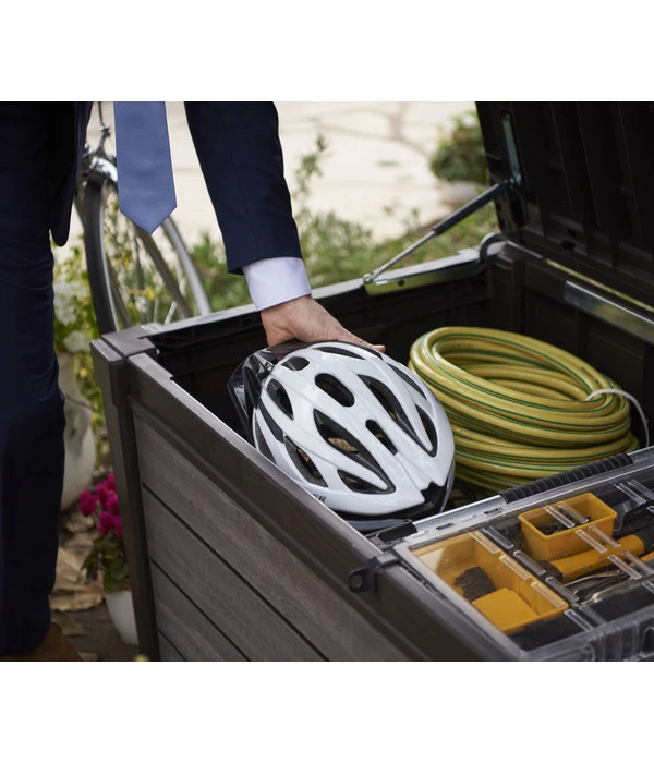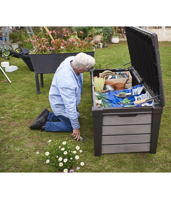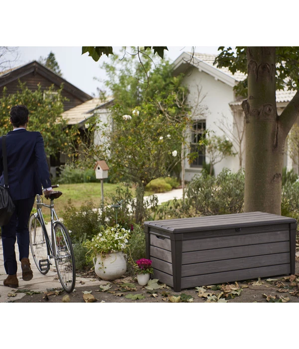 Die Keter Aufbewahrungsbox Brushwood 455 Liter stellt eindrucksvoll unter Beweis, dass Ordnung Spaß machen kann – sie eignet sich als ideale Aufbewahrungsmöglichkeit für alle Utensilien im Haus und Garten. Auch optisch gibt das Zubehör dabei eine gute Figur ab, die natürliche Holzoptik erzeugt sofort eine angenehme, warme Atmosphäre. Zusätzlich kann die streichbare Oberfläche von Ihnen nach Belieben gestaltet werden. Bei den Materialien wurden ebenfalls keine Kompromisse eingegangen: Das hochwertige Polypropylen zeichnet sich unter anderem durch seine besondere Widerstandsfähigkeit gegenüber etwaigen Witterungseinflüssen aus. In der Keter Aufbewahrungsbox Brushwood 455 Liter bewahren Sie so unter anderem Accessoires und Polsterauflagen auf, bei Bedarf greifen sie zudem ohne Probleme direkt auf den Inhalt zu.