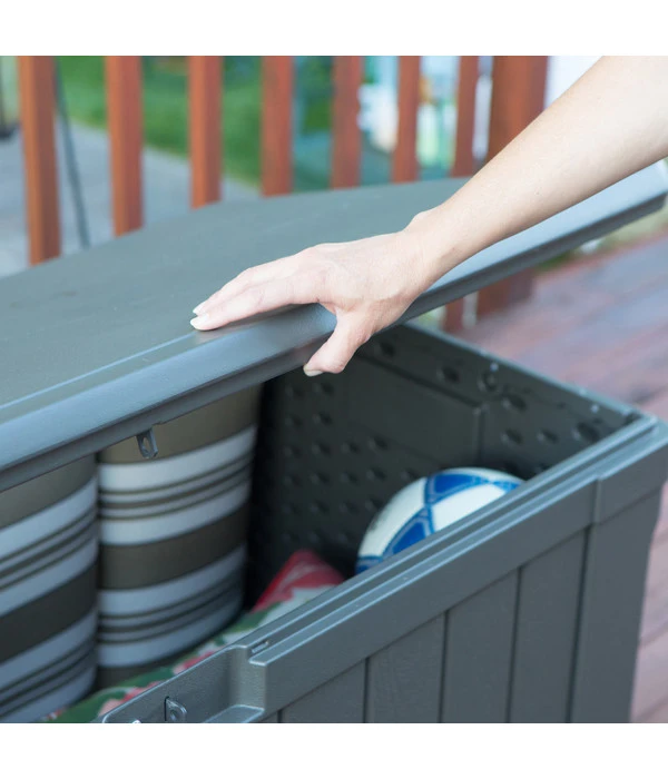 Sie würden gern Ihre Gartenutensilien und das Kinderspielzeug in Ihrem Außenbereich ordentlich und griffbereit unterbringen? Dann sichern Sie sich die praktische Kissenbox von Lifetime! Sie ist ein sehr geräumiger Aufbewahrungsort für die Sitzkissen Ihrer Liegestühle, Poolnudeln, Windlichter oder andere Utensilien, die Sie regelmäßig im Garten verwenden. Durch ihre schlichte Farbe ist die Box sehr gut für ganz unterschiedliche Designkonzepte geeignet. Außerdem ist sie sehr belastbar, sodass Sie sie ideal als Sitzbank verwenden können. Diesen vielseitigen Begleiter werden Sie in Ihrem Garten schon bald nicht mehr missen wollen und die Ordnung ganz sicher zu schätzen wissen.
