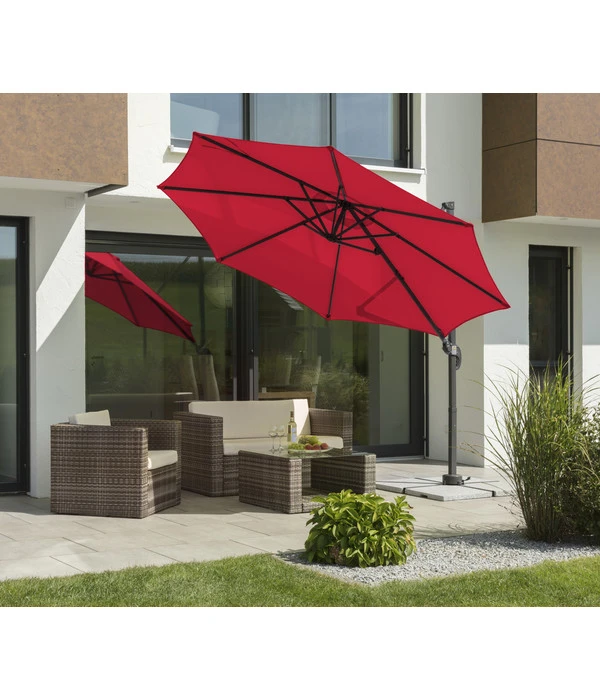 So haben Sie sich das vorgestellt: Aufstellen, an der Kurbel drehen und schon entfaltet sich ein knallroter Sonnenschirm, der bei Ihnen sofort gute Laune auslöst. Der Schneider Ampelschirm Rhodos Junior ist ein absolutes Design-Highlight, das neben seiner attraktiven Bespannung auch mit einem eleganten Gestell in moderner Ampelform begeistert. An diesem Sonnenschirm passt einfach alles! Einmal auf Ihrer Terrasse oder dem Balkon aufgestellt verbreitet er ein herrliches Urlaubsgefühl und verleiht Ihrem Lieblings-Entspannungsort ein ganz besonderes Flair. Sie werden ihn aber auch deshalb schätzen, weil Sie die Möbel in dem Schattenbereich, den die Bespannung mit ihren 300 cm Durchmesser wirft, völlig frei arrangieren können. Denn hier stört kein Schirmmast, der direkt am Tisch oder genau zwischen Ihren Sonnenliegen steht. Greifen Sie also einfach zu und holen sich mit einem Schneider Ampelschirm Rhodos Junior ein tolles Sommer-Accessoire auf Balkon oder Terrasse!