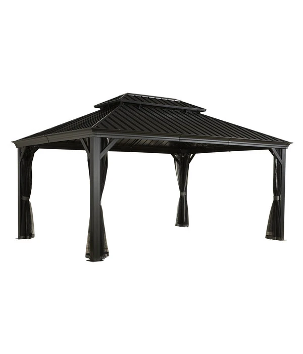 Lauschiger Sitzplatz im Grünen, kühler Schattenplatz an heißen Sommertagen, geselliger Mittelpunkt bei fröhlichen Sommerfesten: der Sojag Pavillon Messina ist ein optisches Highlight in Ihrem Garten, das den Sommer für Sie garantiert noch schöner macht! Und für die Familie und Freunde, die es immer wieder genießen werden, wenn sie unter dem Dach des Pavillons Platz nehmen dürfen. Denn dort werden nicht nur gefährliche UV-Strahlen und Hitze abgehalten, sondern er bietet auch Schutz, wenn plötzlich ein Regenschauer niedergeht. Gönnen Sie sich auch im Garten ein exklusives Dach über dem Kopf und entscheiden Sie sich für den Sojag Pavillon Messina, denn dieser hat ein besonders stabiles, formschönes Dach aus Stahl!