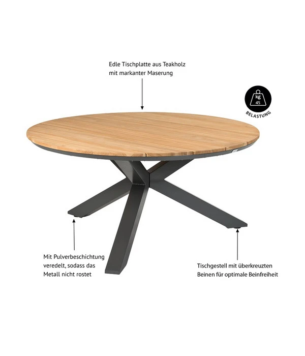 Dass das Tropenholz Teak schon seit Jahrhunderten die erste Wahl für exklusive Outdoormöbel ist, hat sich inzwischen herumgesprochen. Aber wissen Sie auch, warum das so ist? Weil das Teakholz von Natur aus einen sehr hohen Anteil an natürlichen Ölen besitzt, die das Holz so resistent gegen Witterungseinflüsse wie Hitze, Kälte und Regen machen. Auch bei hoher Feuchtigkeit und Temperaturschwankungen wird sich das Teakholz nicht verziehen, sodass Sie den Tierra Outdoor Gartentisch Orbital auch unter freiem Himmel stehen lassen können. Allerdings empfehlen wir Ihnen, gleich ein Teaköl mit zu bestellen und den Tisch damit zu behandeln. Das erhöht die Wetterfestigkeit und Langlebigkeit nochmals und erhält auch den warmen Naturholzton, der einen interessanten Kontrast zu dem dunklen Metall bildet.