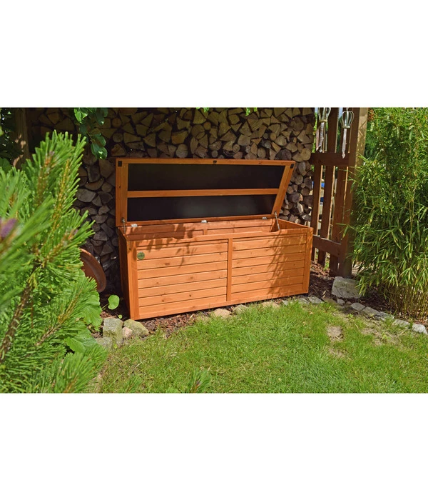 Wer sich im eigenen Garten restlos wohlfühlen möchte, überlässt bei Outdoor-Ausrüstung und Zubehör selbstverständlich nichts dem Zufall. Falls Sie Ihre wichtigsten Gegenstände im Außenbereich auch adäquat unterbringen möchten, dann sind Sie mit der Weka Balkon- und Terrassentruhe genau richtig bedient. Durch ihren beachtlichen Stauraum schafft Sie sofort Ordnung, auch außerhalb der eigenen vier Wände. Gleichzeitig bietet Ihnen das Zubehör im Inneren eine optimale Luftzirkulation, damit sich hier keinerlei überschüssige Feuchtigkeit ansammeln kann. Über die hochwertigen Gasdruck-Teleskop-Scharniere lässt sich die rundum holzschutzlasierte Truhe auf komfortable Art und Weise öffnen und schließen. Darüber hinaus verfügt die Weka Balkon- und Terrassentruhe auch noch über extra abgedichtete Fugen und Tropfleisten. Bitte beachten Sie, dass die Truhe nur für überdachte Balkone und Terrassen geeignet ist.